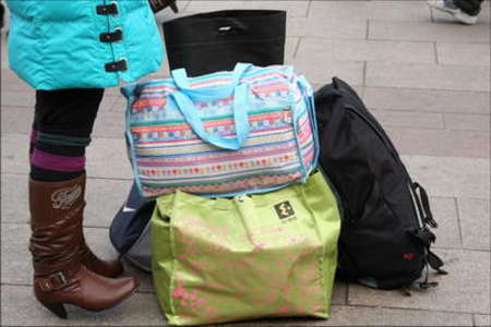 比起花花绿绿的旅行包,还是大包裹最实在,东西太多,干脆直接包裹扛肩头。