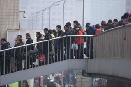 火车站内外人头攒动,火车站的天桥也压力不轻,这几天,几乎每时每刻都挤满了人。