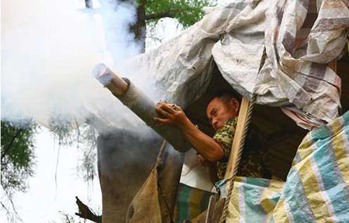 杨友德在哨楼上演示自制土炮
