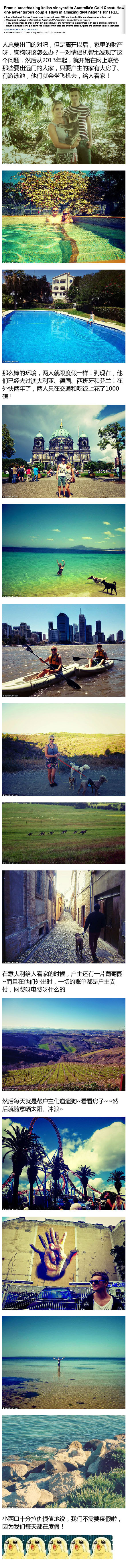 一对没那么有钱、但又很想环游世界的情侣从2013年起就当上了“看家人”!只要谁出远门,并且家里有大房子、大泳池,他们就会飞去给人看家、遛狗、免费地住~~~现在已经去过了澳大利亚、西班牙、德国等等等。快两年了,只在交通上花过钱!平时就是晒太阳、欢快玩耍~