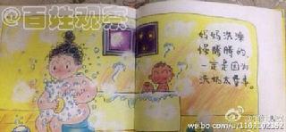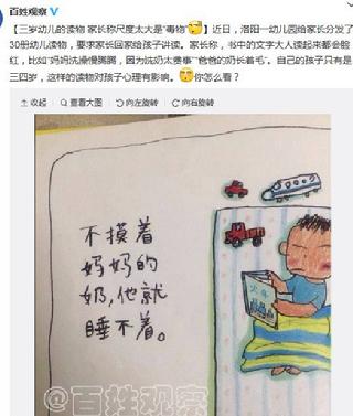 【三岁幼儿的读物家长称尺度太大是“毒物”】近日,洛阳一幼儿园给家长分发了30册幼儿读物,要求家长回家给孩子讲读。家长称,书中的文字大人读起来都会脸红,比如“妈妈洗澡慢腾腾,因为洗奶太费事”“爸爸的奶长着毛”。自己的孩子只有是三四岁,这样的读物对孩子心理有影响。