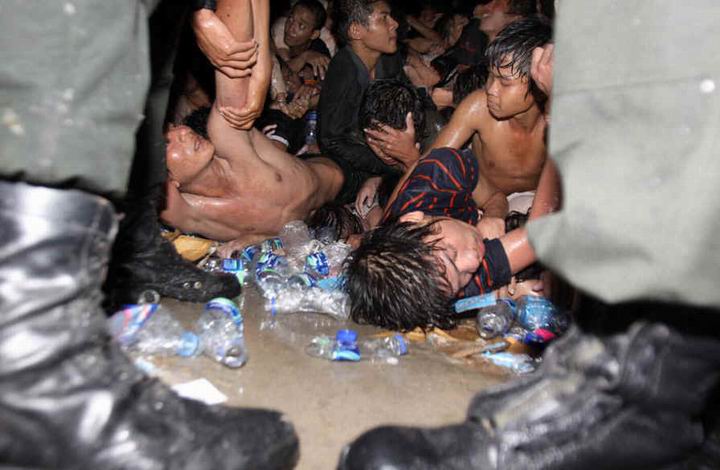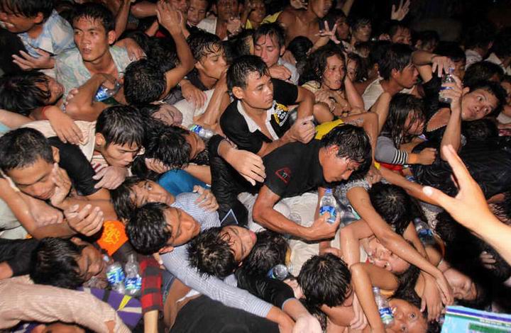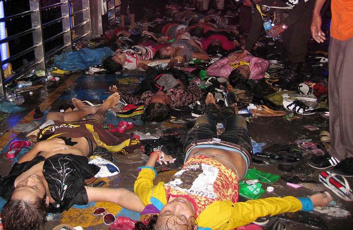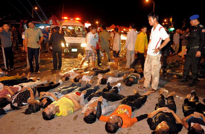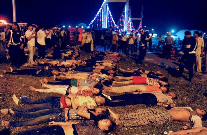当地时间11月22日晚,柬埔寨首都金边钻石岛上发生严重踩踏事件,已造成数百人死亡,估计死亡人数还会增加。图为事发现场的遇难者遗体。