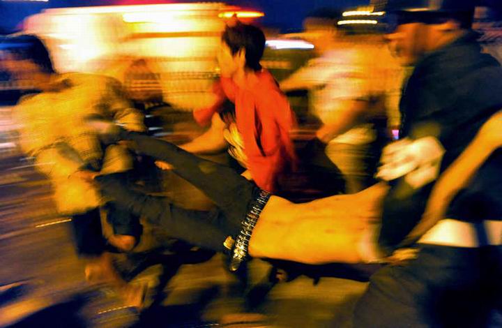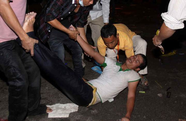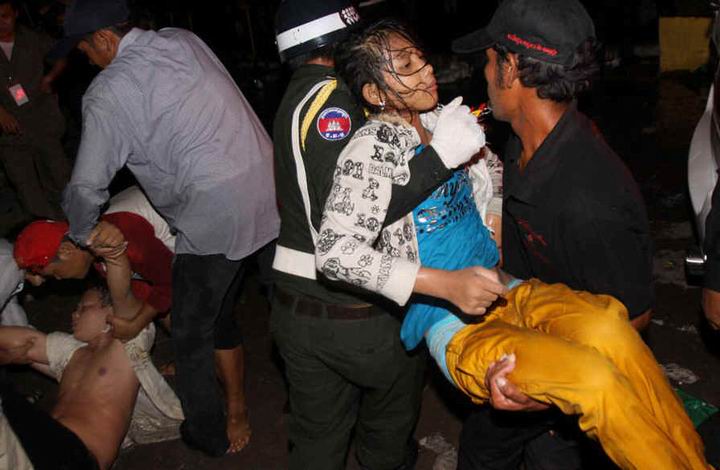 中国驻柬埔寨大使馆领事部说,到目前为止还没有中国人在踩踏事件中伤亡的报告。图为11月23日,人们在抢救伤员。