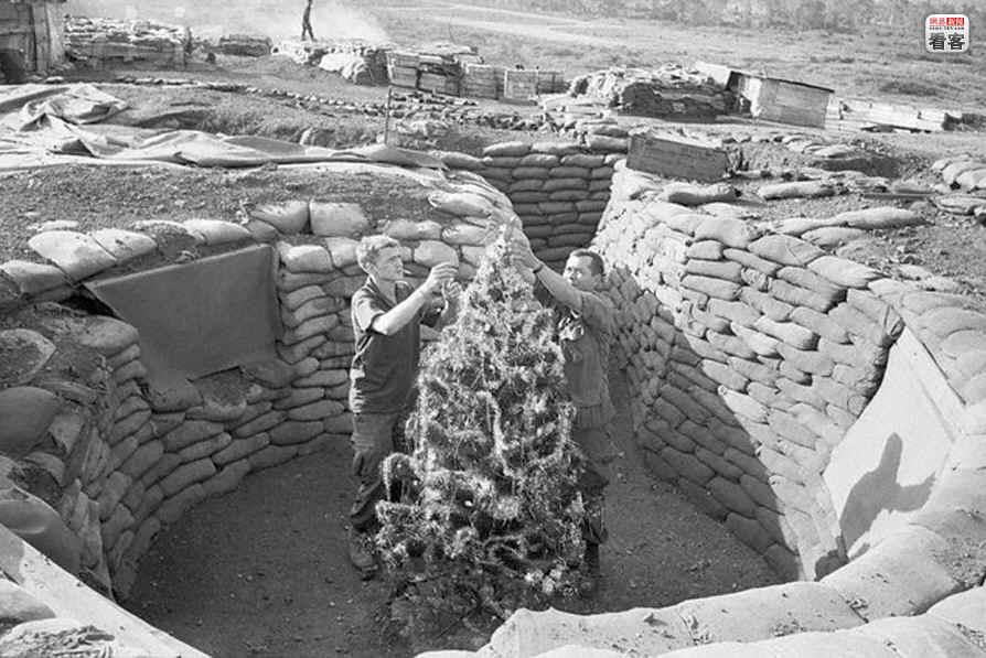 当地时间1969年12月7日,南越德立的美国特种部队基地,巴迪-布瑞克中士(左)与指挥官埃内斯托·弗洛雷斯两人在一座空置迫击炮掩体里树起一棵圣诞树。