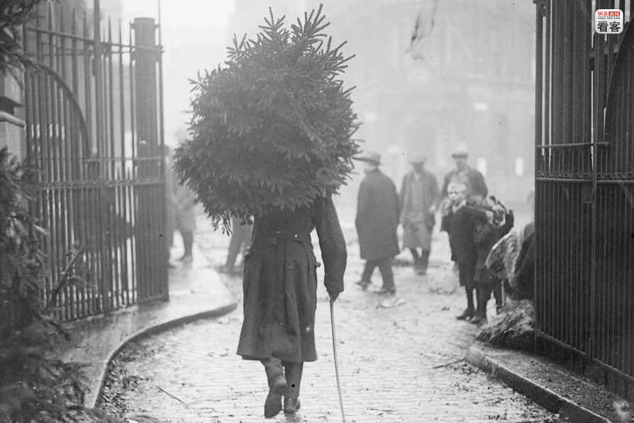 当地时间1915年12月,英国街头,一位从前线回家度假的士兵肩扛一棵枞树,手提马刀回家过圣诞节。
