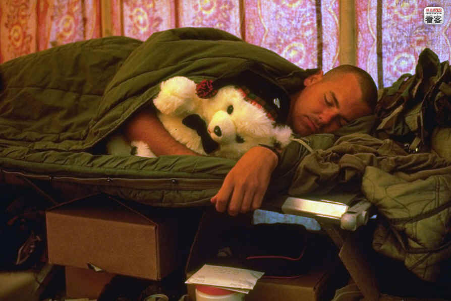 当地时间1990年11月,沙漠风暴行动前夕,驻扎科威特的美国陆军第一骑兵师坦克手克林特·拉科正在睡觉,怀里是他女朋友寄来的圣诞礼物,一只泰迪熊。