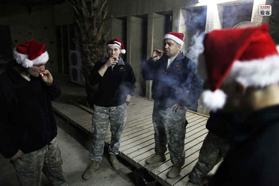 当地时间2008年圣诞节清晨,伊拉克,几名美国士兵结束庆祝活动后围在营房外抽烟。