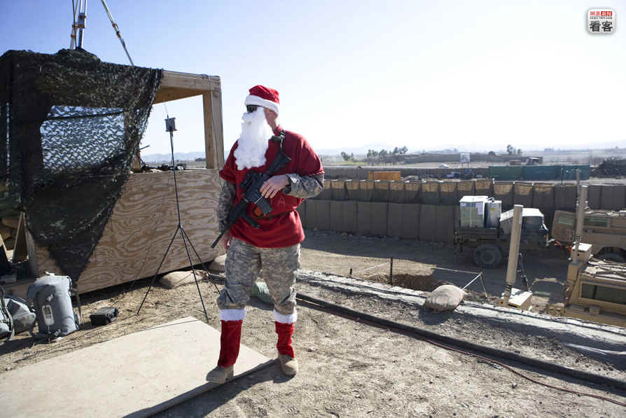 当地时间2008年12月25日,阿富汗霍斯特省萨巴利区一处美军哨所刚刚遭到来自塔利班的迫击炮袭击,一名101空降师的士兵身穿圣诞老人服站在哨所顶端警戒。