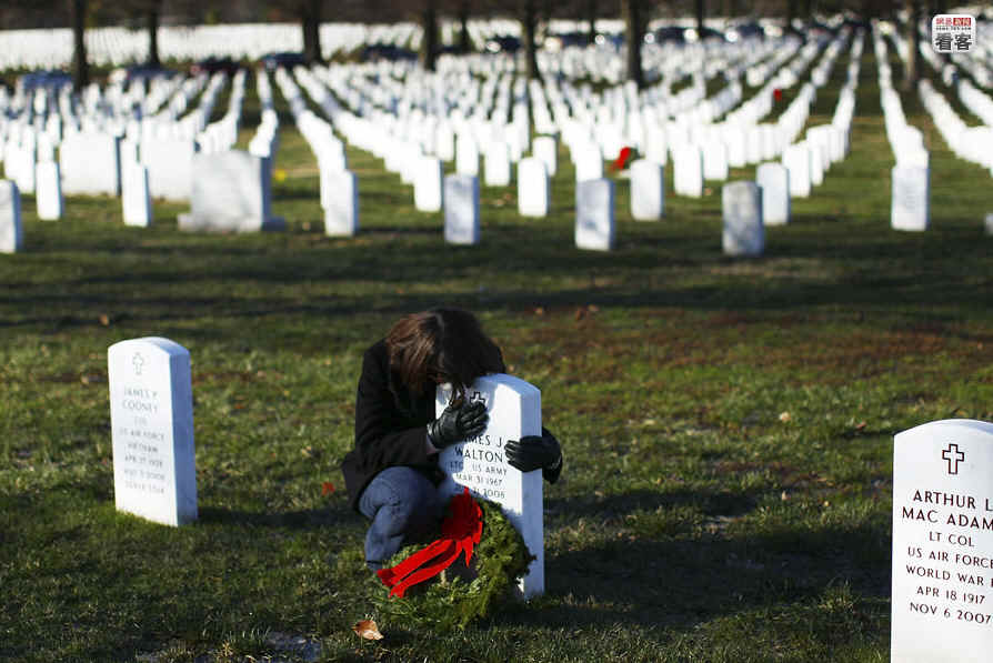 当地时间2009年12月12日,萨拉·沃尔顿在阿灵顿国家公墓拥抱她死去的丈夫詹姆斯·沃尔顿中校的墓碑。脚边是志愿者们安放的圣诞花环——圣诞节期间,总共一万五千个花环将摆满整个墓地。