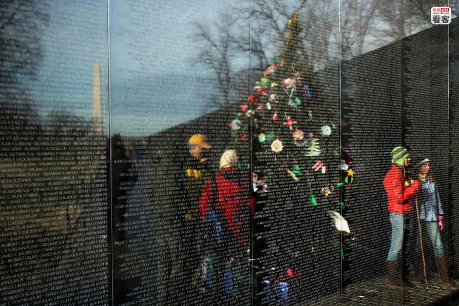 当地时间2008年12月23日,华盛顿特区,志愿者们正在为越南战争纪念墙安放圣诞树,树上悬挂着附近学校的学生们为当年的战死者所写的圣诞卡。