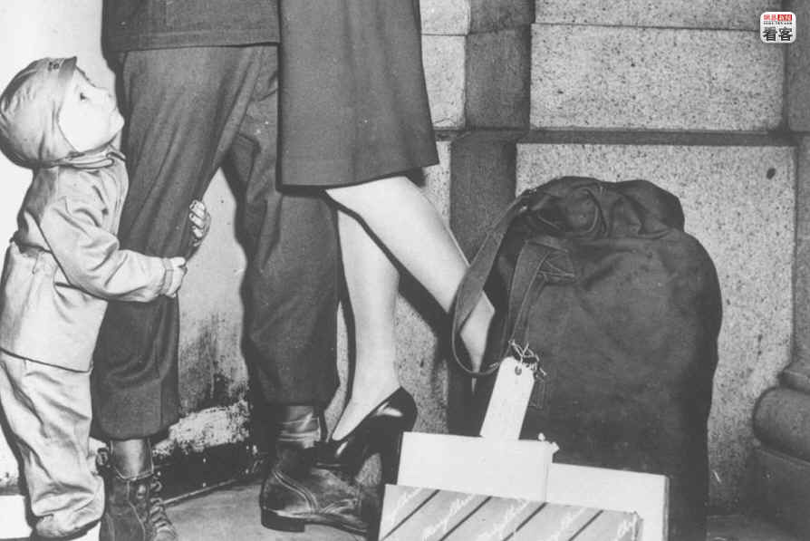 当地时间1944年圣诞,一名刚刚从前线归来的美军士兵与他的妻子拥抱,他们幼小的孩子抱着父亲的腿不放。