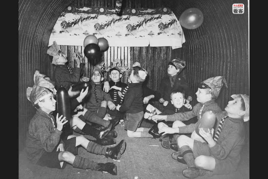 1940年12月17日,英国,德国空军的轰炸让人们的生活偏离日常。巴纳多博士家的孩子在防空洞里享受他们的圣诞聚会。
