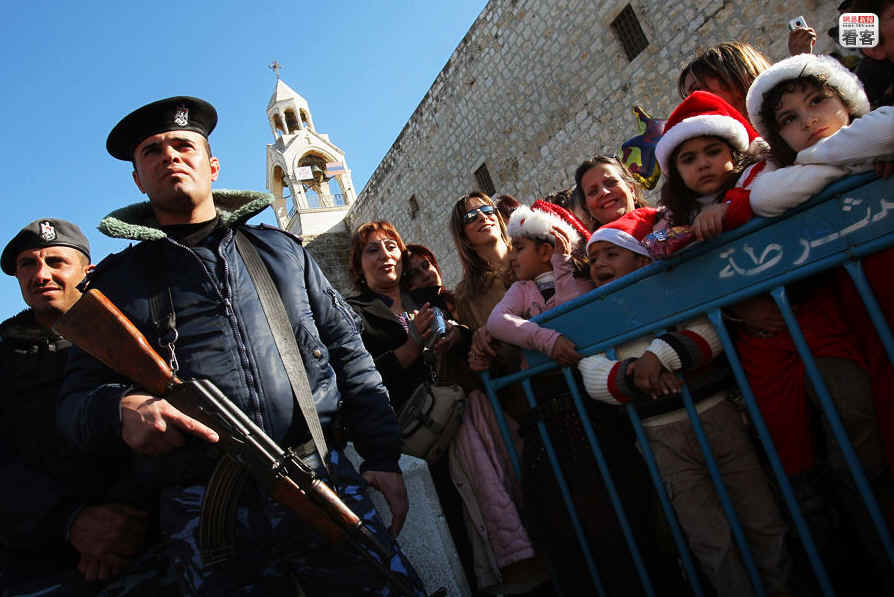 当地时间2007年12月24日,基督教圣城伯利恒圣诞教堂门外,两名巴勒斯坦警察正在站岗值勤,预防伊斯兰极端份子发动恐怖袭击。