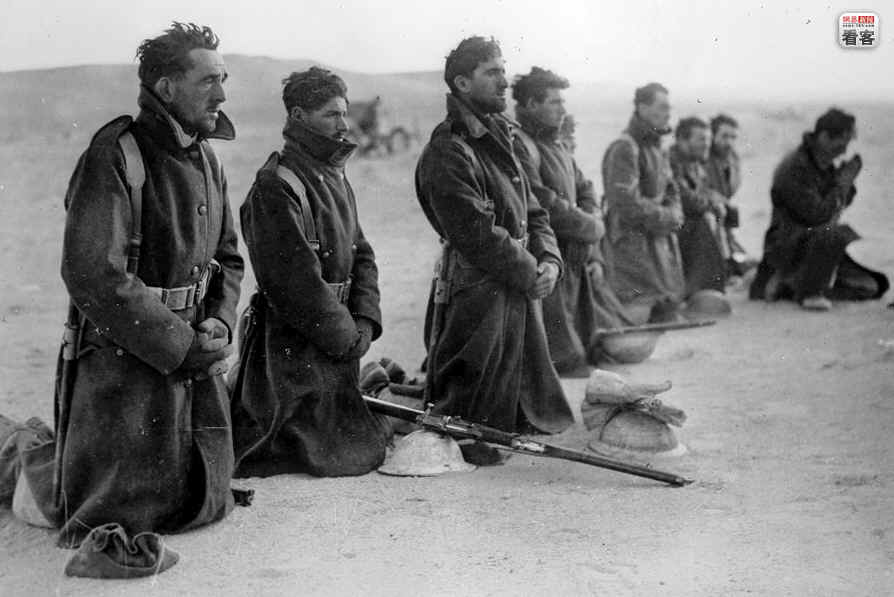 当地时间1940年12月25日,北非,利比亚巴尔迪亚的沙漠中,英国军队发动了针对意大利人的利比亚战役,英军士兵迎着朝阳做圣诞祈祷。