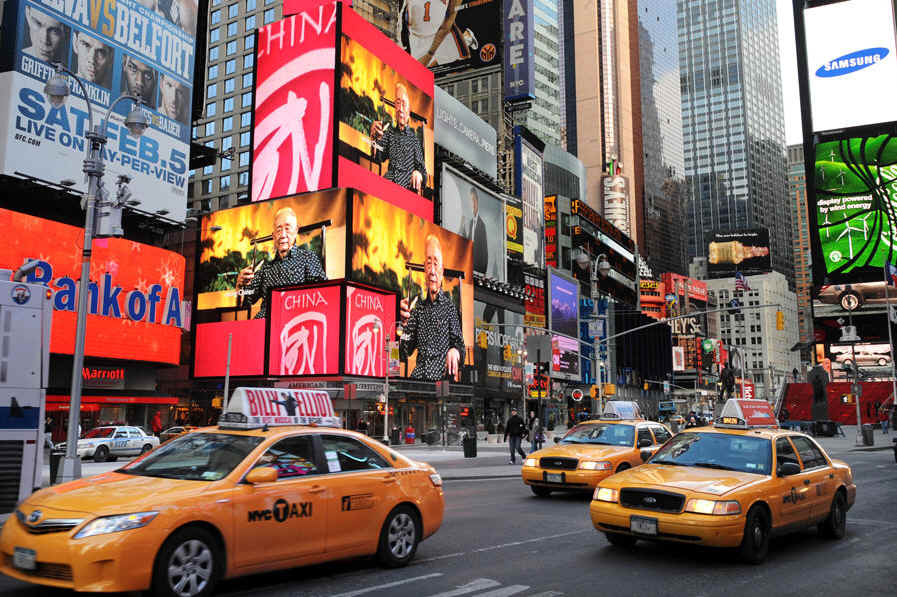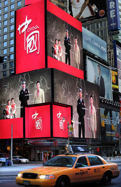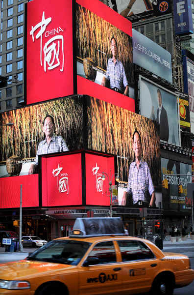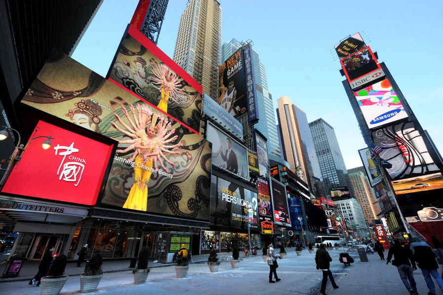 1月17日,美国纽约时报广场的电子显示屏正在播出《中国国家形象片——人物篇》。当日,《中国国家形象片——人物篇》开始在纽约时报广场大型电子显示屏上以每小时15次、每天共300次的频率播出。至2月14日,中国国家形象片共计将播放8400次。《中国国家形象片——人物篇》中包括了杨利伟、姚明等各领域优秀代表以及普通百姓,旨在向全世界展示立体的中国。