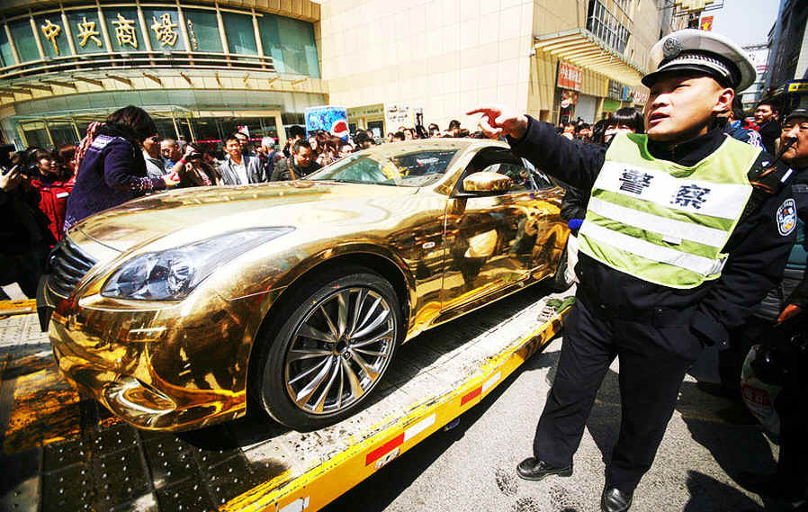 2011年3月29日,南京新街口,一辆车身贴满黄金的“黄金跑车”停在马路边上,车主停好车后随即离去,过了约10多分钟,车被交警以违停拖走。有市民伸手触摸车身后表示,这车应该是金色的油漆或者金箔之类的材料做的。