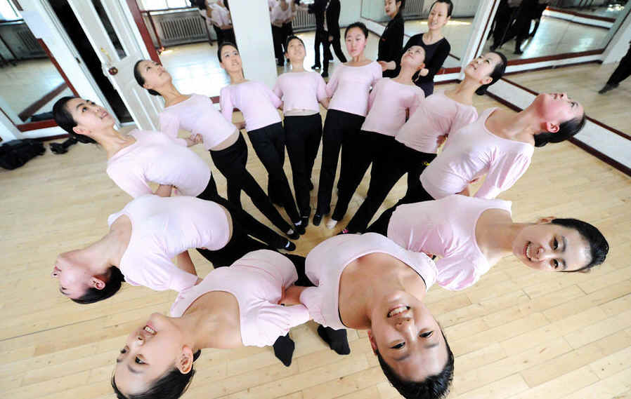 2011 年3月31日,航空服务专业高一年级的学生在进行芭蕾以及形体练习。哈尔滨市航空服务中专十年来为国际和国内的各大航空公司先后输送了200批,近 6000名空乘人员。今年,该学校的百余名航空服务专业毕业生,即将于今年6月奔赴韩亚航空公司、卡塔尔航空公司和国内的各大航空公司进行工作。