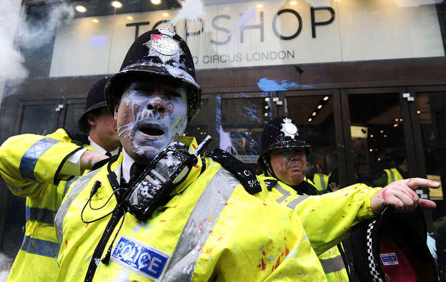 当地时间2011年3月26日,英国伦敦,一名警察和抗议者发生冲突。当天,英国伦敦26日爆发自2003年以来最大规模的示威活动,超过25万人涌上街头,抗议政府采取的大幅度裁减预算措施。参加示威的有公务员、退休人士和学生。原本主张和平进行的示威,仍充满暴力色彩。当地警方逮捕了214名“滋事者”,另有84人在冲突中受伤。
