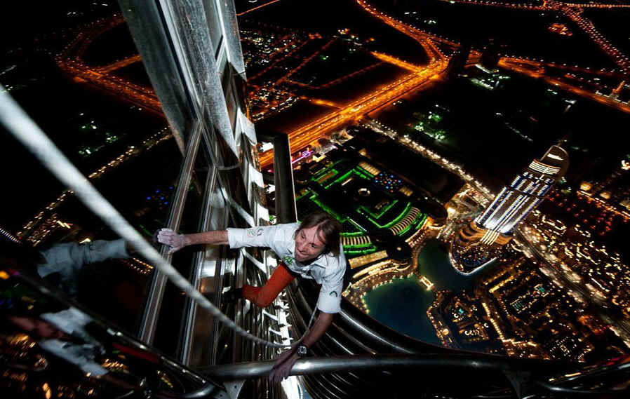 当地时间2011年3月28日,迪拜,现年48岁的“蜘蛛人”法国男子阿兰·罗贝尔借助绳索攀爬数小时,成功登顶世界最高建筑哈利法塔。哈利法塔位于阿拉伯联合酋长国迪拜,原名迪拜塔,2010年1月4日落成,高828米,有160层,观景台设于第124层。