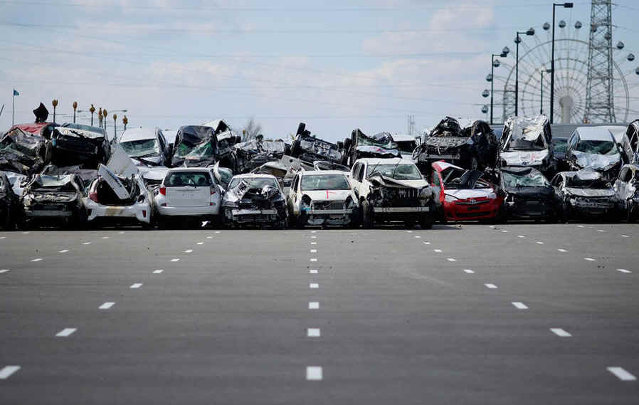 当地时间2011年3月28日,日本仙台港,被海啸损坏的汽车。自11日日本发生里氏9级大地震以来,日本汽车生产链遭到毁灭性打击,各汽车厂商零件供应不足,日本国内的汽车生产陷入瘫痪。从11日至25日的两周内,日本八大汽车厂商共减产约35.66万辆。