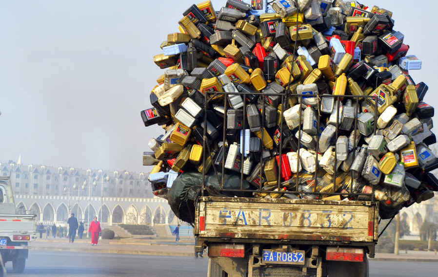 2011年3月31日,一辆载满各色塑料桶的车辆从银川市北京路驶过。据了解,在城市生活垃圾减量化、资源化、无害化处理过程中,宁夏率先探索城市生活垃圾分类回收处理模式,形成了社区居民分类、物业统一收集、企业集中处理,以此实现生活垃圾中可回收利用资源全部回用。