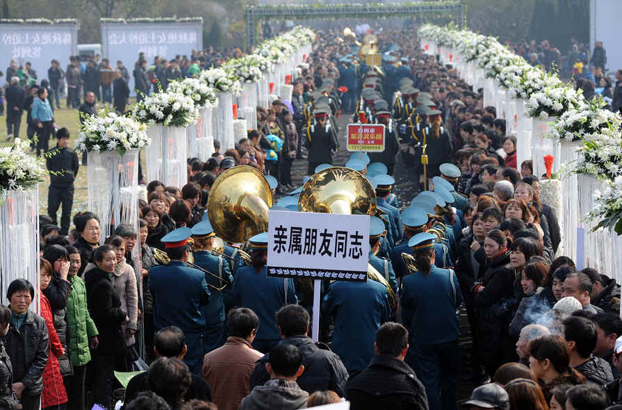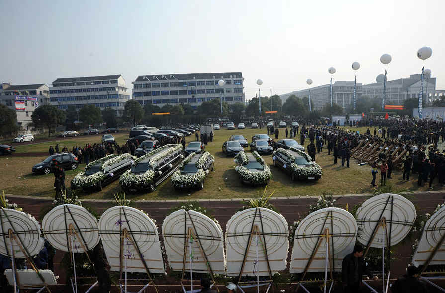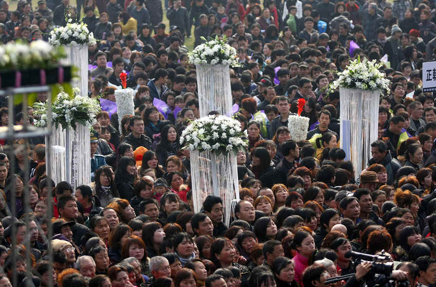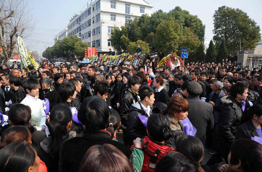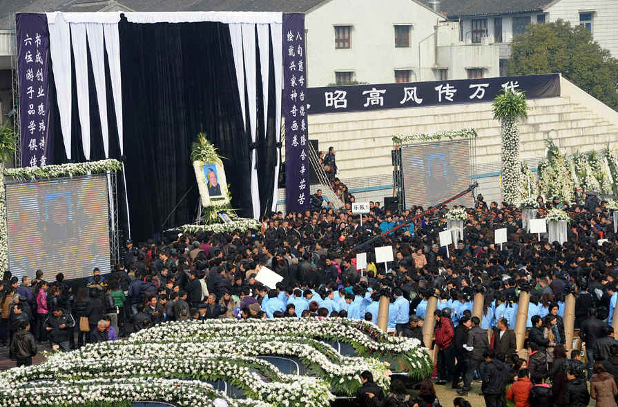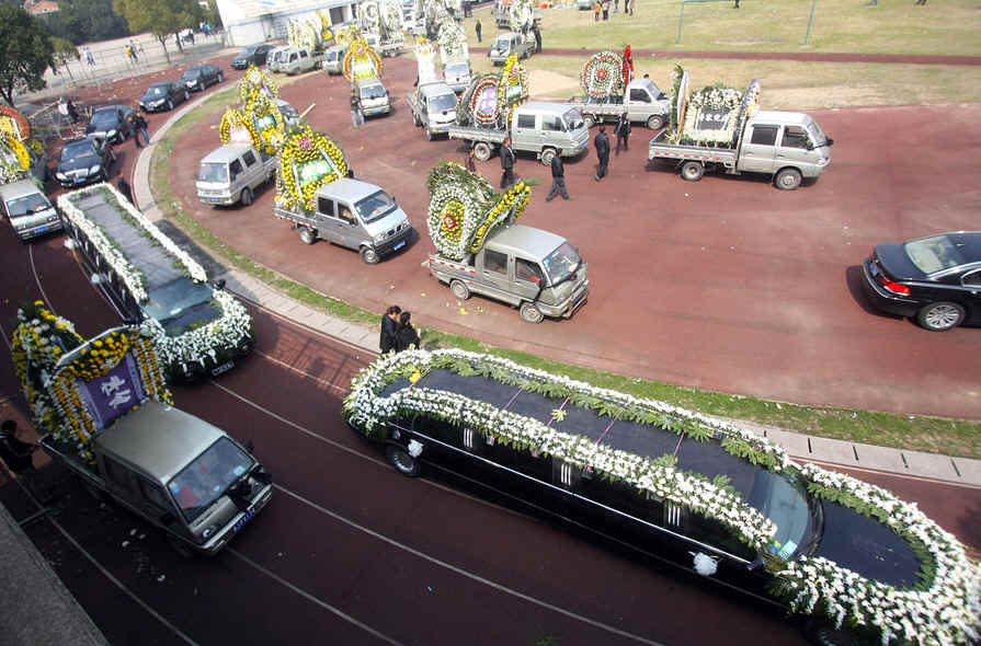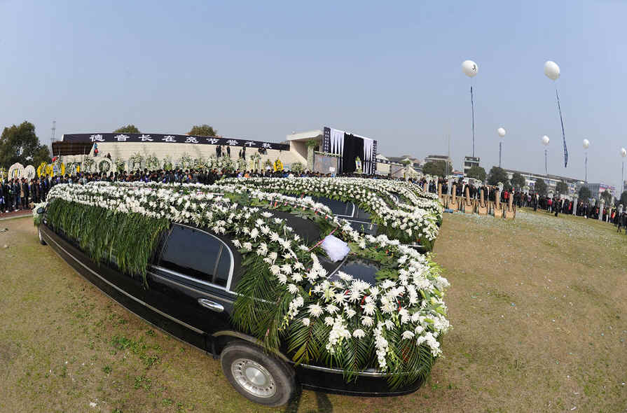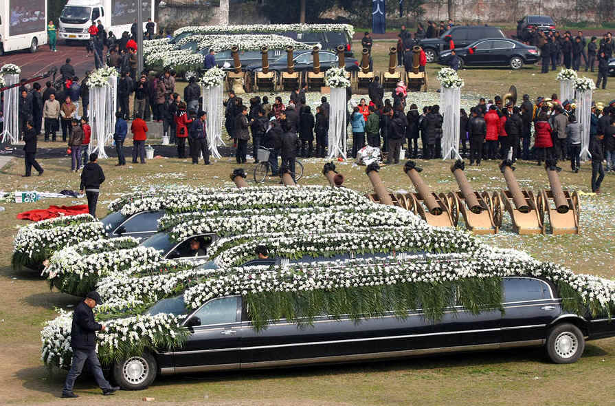 浙江省温岭市新河中学大操场,当地企业家为母亲举办豪华葬礼。操场上停着大量豪车,光鼓乐队就有20来支。现场地毯铺地,花圈有上千个,还有礼炮,光承担摄像的就有8台机位。来吊唁的亲属和企业工人有几千人,加上围观群众,足有上万人。据透露,整场葬礼的费用在500万左右,堪称温岭市有史以来最隆重的葬礼。送葬队伍经过之处造成了交通阻塞。