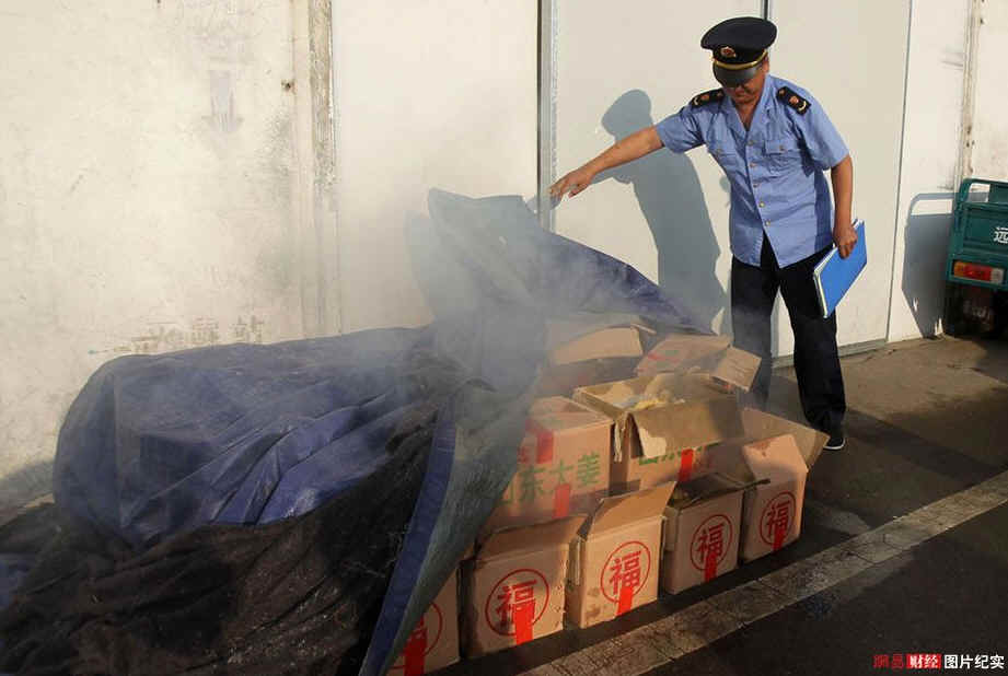 北京硫磺熏制生姜2011年5月26日,在北京顺义区石门市场一商铺门前,工商执法人员揭开一个生姜熏制设施的塑料布,大量刺鼻的硫磺燃烧后产生的烟雾冒了出来。记者暗访发现,数家批发生姜的商户,利用硫磺熏蒸色相不好的生姜,熏好后进行批发。4月23日,国务院食品安全委员会办公室公布47种可能在食品中“违法添加的非食用物质”中,就有工业硫磺,生姜成为容易使用的食品之一。