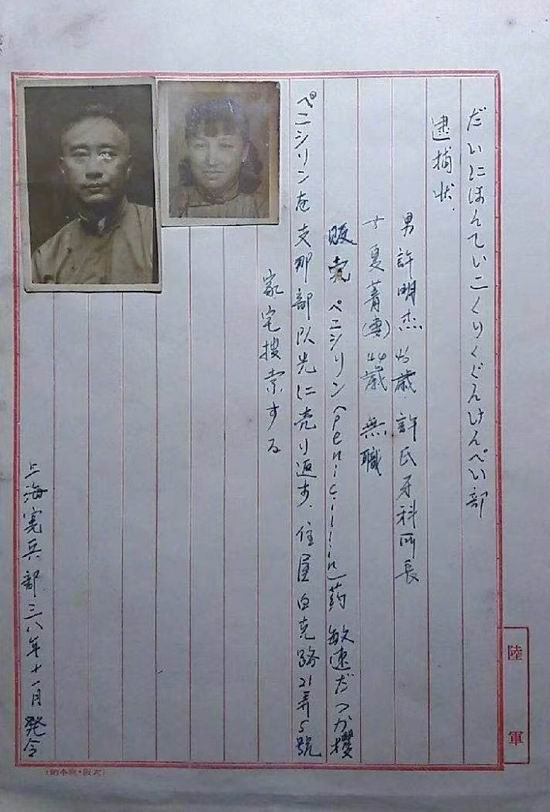 逮捕令用日文写成,附有一男一女两张照片。大概意思是:男子叫许明杰,46 岁,是许氏牙科诊所的所长;女子叫夏菁,44 岁,没有工作。他们被逮捕的罪名,是给中国军队提供盘尼西林。他们在白克路 21 弄 5 号的住所,也遭到了搜查。落款时间是 38 年 11 月。