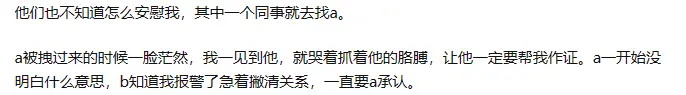 他跟警察说从来没有这个事,女生开口,说有证人,A看见了,A告诉我们的。