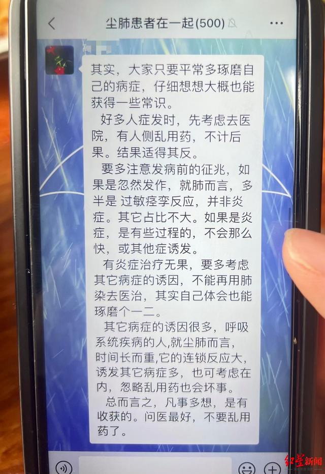 大部分时候,他会发一些和尘肺病相关的知识,回答病友提出的疑问,甚至会鼓励病友让他们积极面对生活。当然偶尔也会发一些生活中的牢骚,比如“羡慕你们,唉,我太孤怜”“我嘛,听天由命吧,奈何呀”……