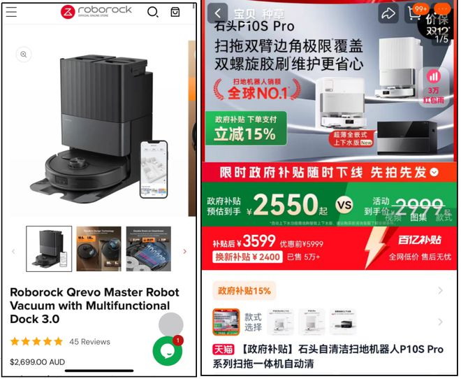 科沃斯的扫地机器人 DEEBOT X1 OMNI,淘宝上 4700 就能拿下,到了澳大利亚卖出 13000 元,?溢价 177%。