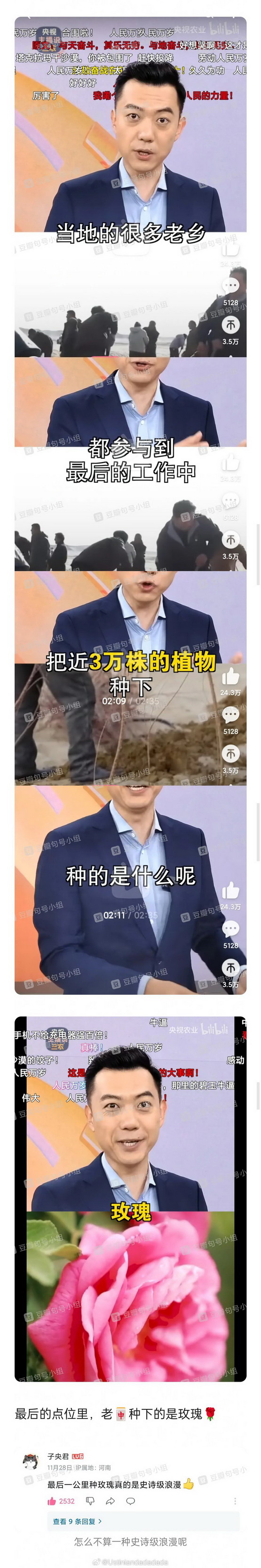 玫瑰好像是有固化风沙功能根系的特殊品种,确实在有科学依据的基础上做到了人文主义的情怀,但你要硬杠有没有更好的植物选择,那大概率是有的,但不过是九十九分和一百分的区别罢了,相比缺少的一分,这种浪漫主义的情怀和以此为基础的宣传效益大概可以给原本的九十九分加上二十分吧。锁住几千公里的黄沙,在最后一公里走花海。