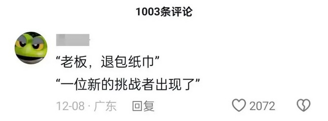 有道是,敢找服务员退纸巾的,自觉上台成为挑战者。