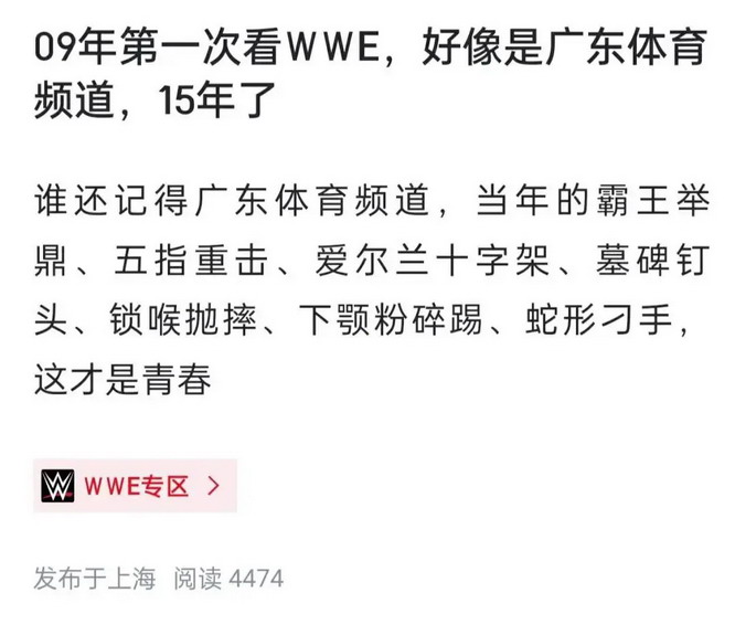 在广东体育频道之外,陕西、江苏、天津、福建等地方卫视的体育频道都曾转播过 WWE,电视媒体统治传媒的时候,就曾给现在的观众种下过种子。