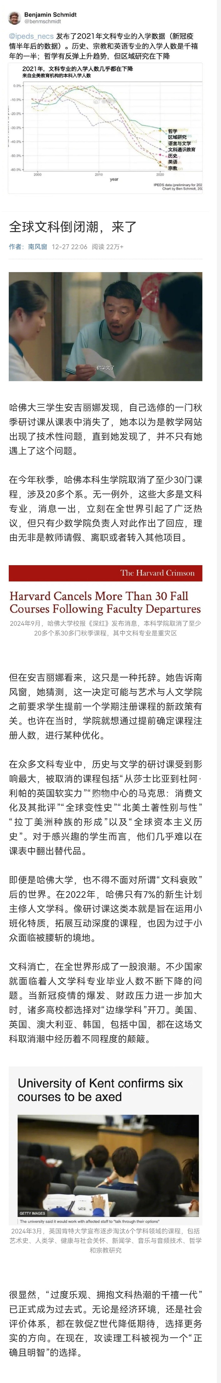 在 20 世纪 70 年代,这所学校就读人文学科的学生比例接近 30%。从 15 年前到新冠疫情暴发之初,哈佛大学英文专业的学生人数减少了约四分之三 —— 在 2020 年,这所 7000 多人的大学里,只有不到 60 人在学英文专业。