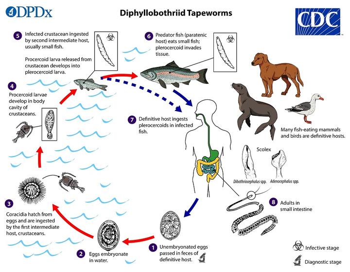 顺便一提,人也可能感染鱼肉绦虫。鱼肉绦虫是人能感染的最大的寄生虫,长度可达 20 米。千万不要吃生的淡水鱼。而抹香鲸感染的 Tetragonoporus calyptocephalus,有 40 米的记录。