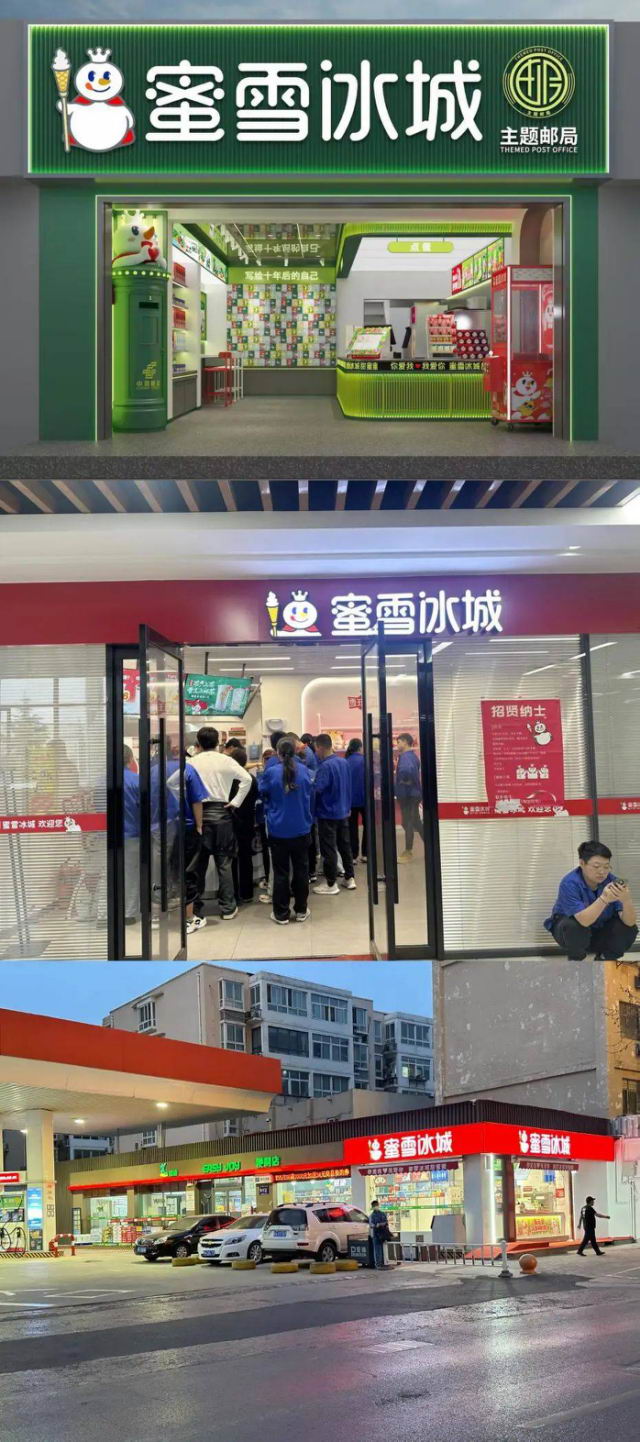 加油站、工厂园区,还有中国邮政的地盘,都能看到蜜雪冰城的门店。