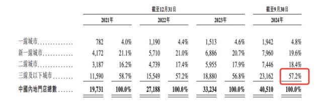 截至 2024 年 9 月 30 日,内地蜜雪冰城的所有门店有 57.2% 位于三线及以下城市。全国大概 30000 个乡镇,蜜雪冰城已经拿下了 4900 个, 1700 个县城、超过 300 个地级市有雪王的身影。