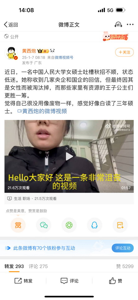 @sven_shi:性别问题其实长期以来都是被选中承担大众怒火的出口。今天网上有个很火的视频,是一个中国人大的女孩子在网上吐槽她就业困难,最后找不到工作她 “推测” 是因为她的是女生。因为没有一家正经的国企会在公开招聘面试中说应聘者是女生,所以不要她了。