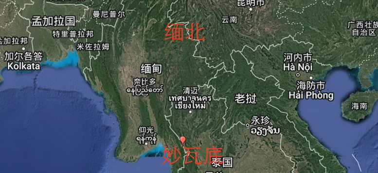 这次王星失踪的地方,离咱们老远,我去奥维地图上截了个图,那个妙瓦底在下边,之前清剿的是上边: