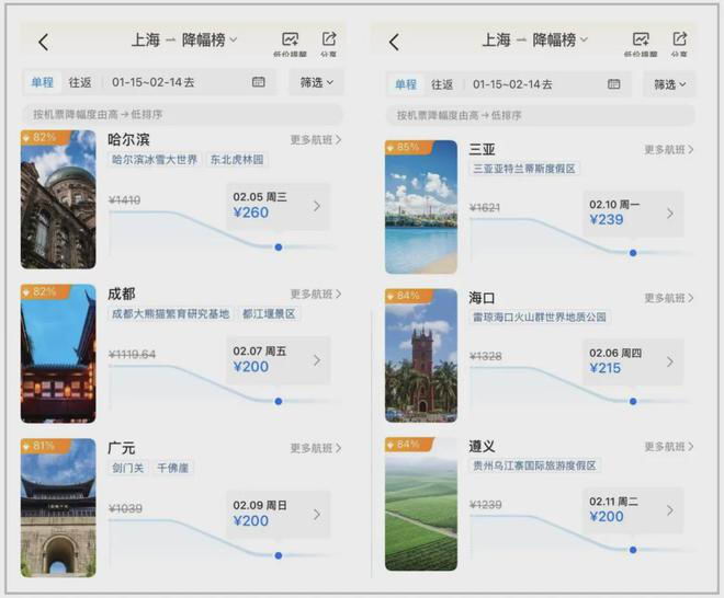 上海去三亚、哈尔滨、成都,基本.200.多块就能飞,最高降幅可达.80%