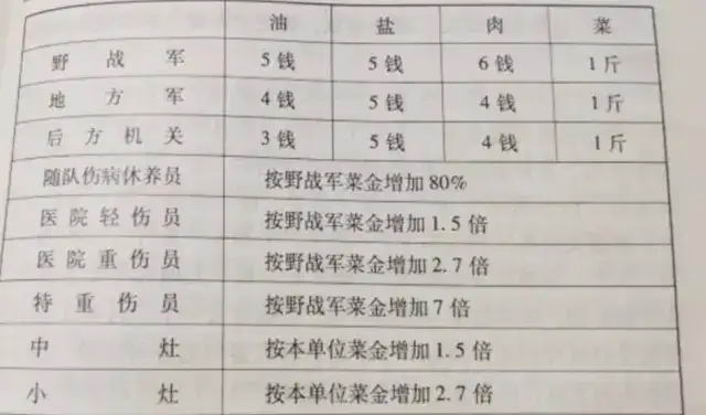 在解放战争中,我军出台了《中国人民解放军供给标准》对我军补给进行了了分类和定级:分 别定为野战军、地方部队和机关后勤单位,其中野战军因为作训任务大,因此所需的补给大。按照野战军的菜金标准来看——每人一天是是2两肉、16两菜和28 两大米,不仅如此,每个士兵都还会发香烟、肥皂、毛巾等生活用品。