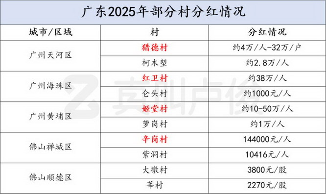 哪怕像广州知识城的莲塘、汤村,佛山的大墩村、莘村等,人均分红也有 2 千元~1 万元不等。