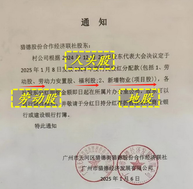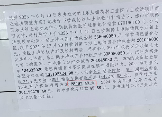 包括佛山乐从镇的荷村,2024 年分红就包含了土地收回补偿款,每人每股可以拿到 2.8 万元。