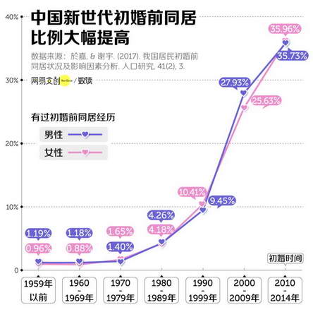 《人口研究》中的一篇论文同样表明,不同世代初婚前同居的比例明显上升。在 1959 年初婚的男性和女性中,初婚前同居的比例才不到 2%,而在 2010—2014 年初婚的人群中,超过三分之一都在初婚前与伴侣同居 [4]。