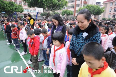 3月24日,福建南平实验小学教师在学校门口向学生发放小白花。