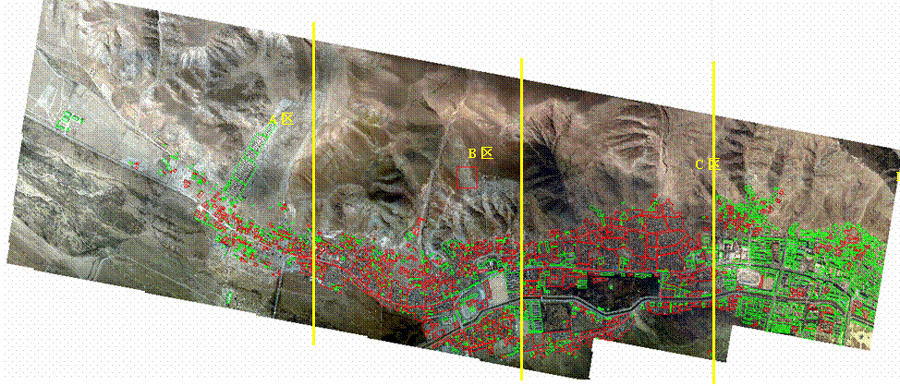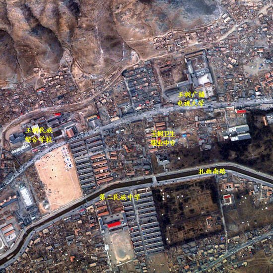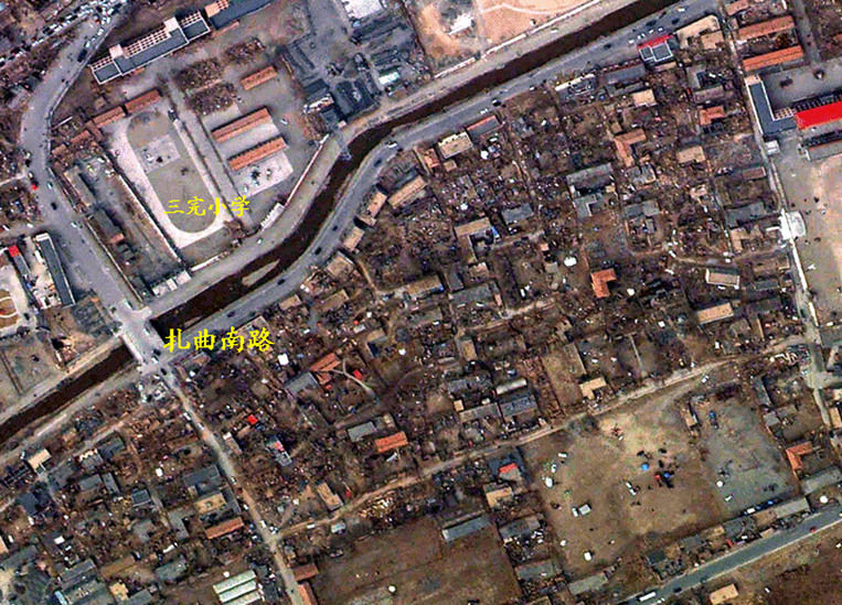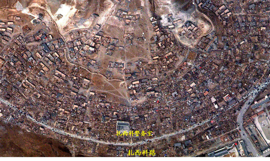 这是扎曲南路周边区域航空遥感图。根据中国科学院对地观测与数字地球科学中心派往青海玉树震区遥感飞机传回的第一批高分辨率遥感图像,玉树县结古镇房屋倒塌严重,全部遥感监测区域范围房屋倒塌率达到61.7%。