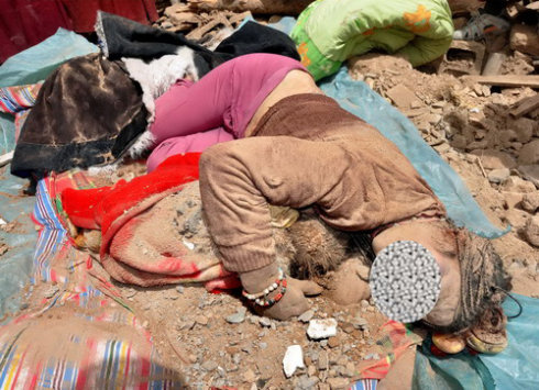 废墟中,两位母亲用身体护着孩子