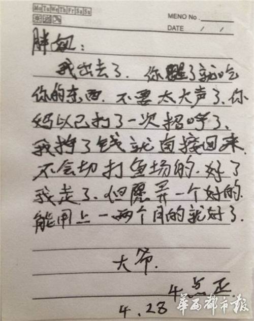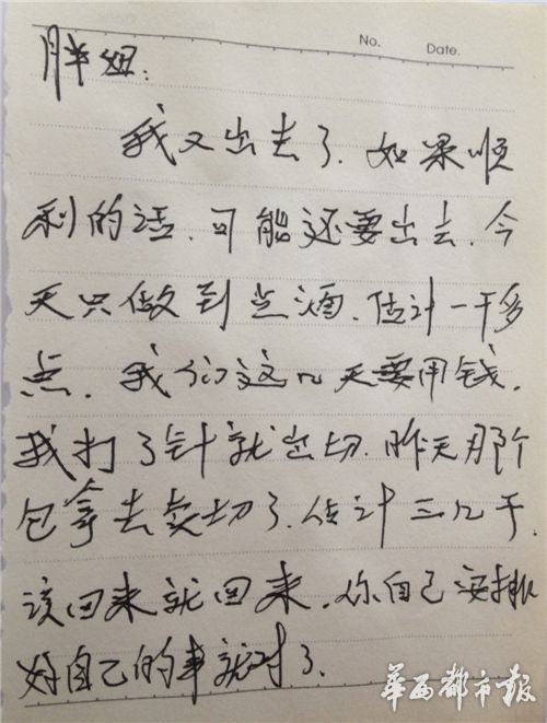“胖妞,我出去了,你醒了就吃你的东西……我挣了钱直接回来,但愿弄一个好的,能用上一两个月就好了。”成都41岁男子周旭每次外出偷盗前,都会给家中的女友留下一张爱的字条,叮嘱对方照顾好自己,近日,周旭被警察抓捕。