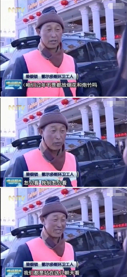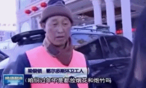 记者:“大爷,过年放鞭炮这事您怎么看?”环卫大爷:“怎么看?我怎么看?我们都站在这朝天看。”
